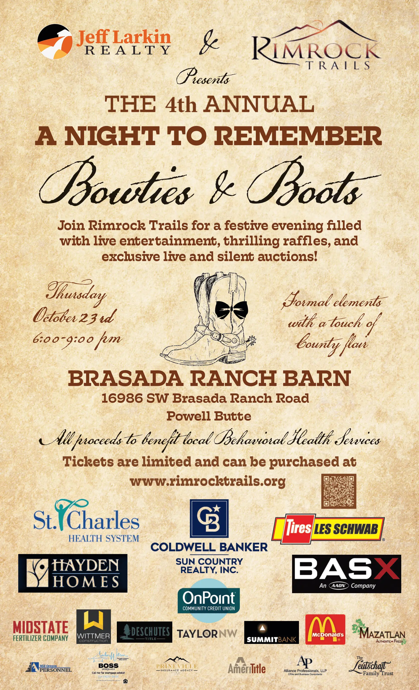 Prineville, OR October 8, 2025 – On October 23, Rimrock Trails Treatment Services, in partnership with Jeff Larkin Realty, will host the 4th Annual A Night to Remember: Bowties & Boots at the stunning Brasada Ranch in Powell Butte. This highly anticipated event brings together the communities of Bend, Redmond, Prineville, and beyond to support accessible mental health and substance use treatment services throughout Central Oregon.