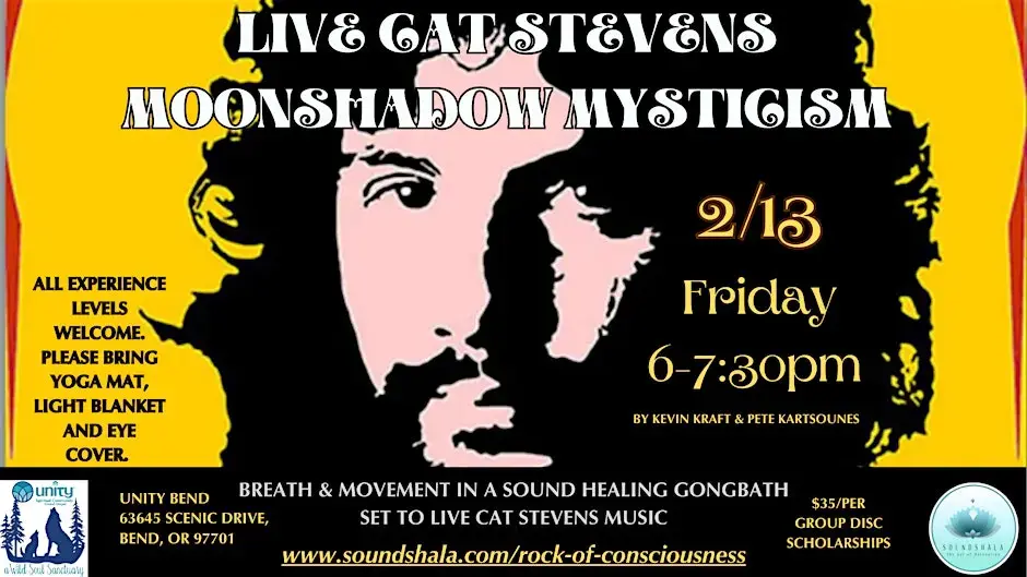 The Rock of Consciousness Cat Steven’s Moonshadow Mysticism is a tribute to the legendary music and messaging of Cat Stevens. Cat Stevens’ music carried a rare depth of consciousness, blending introspection, spirituality, and social awareness. Through songs like “Wild World,” “Father and Son,” “Morning Has Broken,” “Peace Train,” and “Moonshadow,” he invited listeners inward, questioned modern life, and offered compassion as guidance—helping a generation reconnect with meaning, reflection, and the possibility of personal and collective transformation.