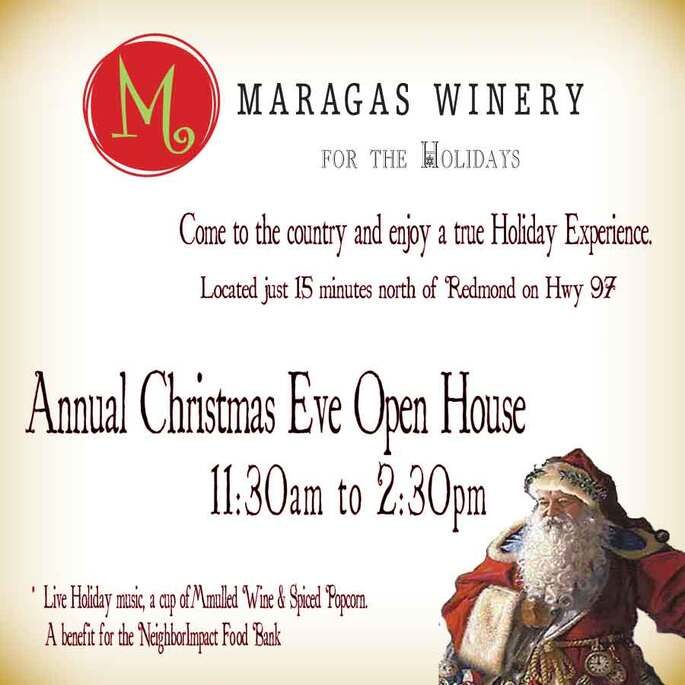 An old fashioned Christmas tradition at our Central Oregon winery.  Cozy and festive surroundings with Live Christmas favorites sung by Samantha Maragas, returning from the Pt. Park Conservatory for Performing Arts. With a suggested $10 donation to NeighborImpact Food Bank, you’ll also receive a cup of mulled wine and spiced popcorn. For every $10 donation received, Maragas Winery will add another $5. 100% of all donations go to NeighborImpact.  Located in the pastoral countryside of Culver, yet easy and quick to get to from Central Oregon, just 10 minutes north of Home Depot in Redmond on Hwy 97. More details at www.maragaswinery.com