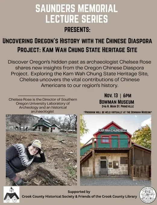 Crook County Historical Society and Friends of the Crook County Library invite the public to the next installment of the Saunders Memorial Lecture Series at the Bowman Museum in Prineville. On Thursday, November 13 at 6:00 PM, director of the Southern Oregon University Laboratory of Archaeology (SOULA), Chelsea Rose, MA, RPA will present “Uncovering Oregon History with the Chinese Diaspora Project.”