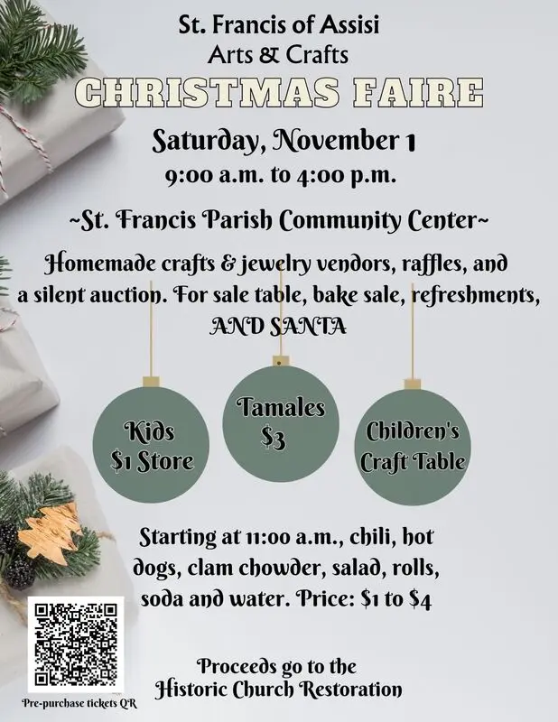 Join us for the annual St. Francis Arts & Crafts Christmas Faire on Saturday, November 1st from 9:00 AM to 4:00 PM at the St. Francis Parish Community Center. This festive event features a variety of homemade crafts, jewelry vendors, raffles, a silent auction, and a delightful bake sale. Refreshments will be available throughout the day, and Santa will make a special appearance to spread holiday cheer.