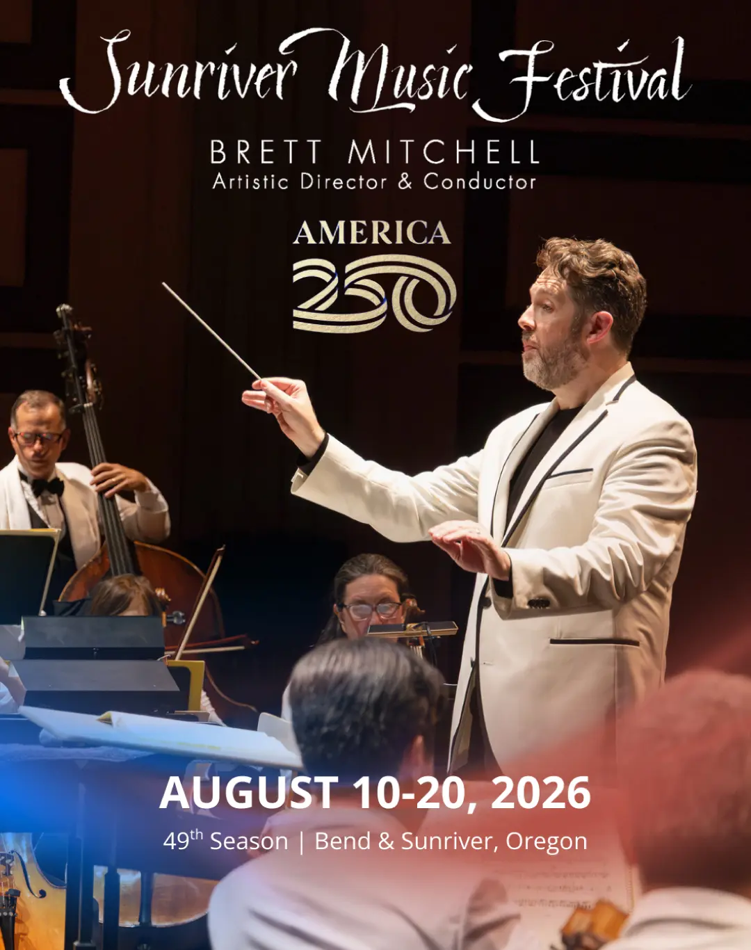 Sunriver Music Festival fills Central Oregon with music! In August 2026, Artistic Director & Conductor Brett Mitchell will lead world-class orchestra musicians and acclaimed soloists in a remarkable 49th season.